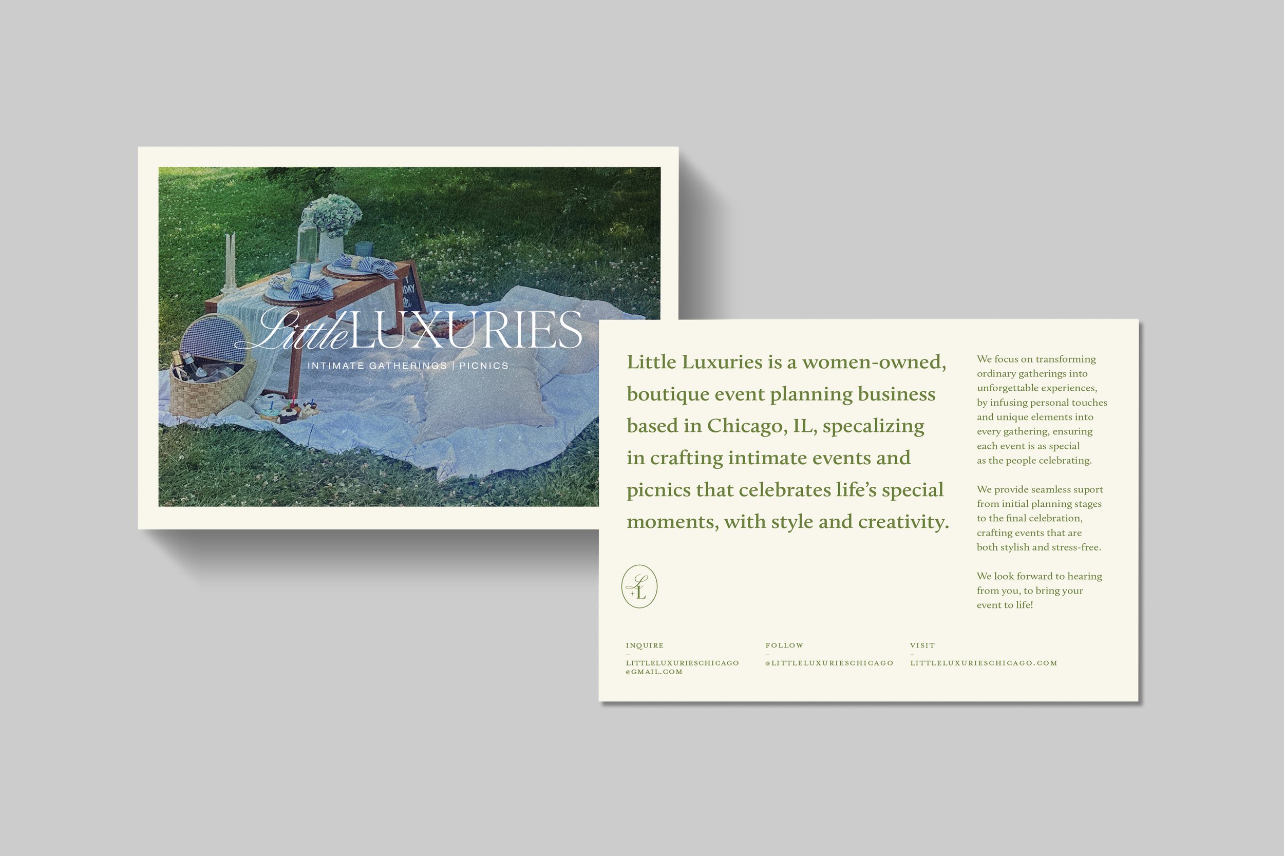 Little Luxuries is a boutique event company that specializes in intimate, elevated gatherings. From dreamy dinner parties to chic picnics and stylish celebrations. The creative direction is centered around themes of feminine elegance, modern playfulness, and approachable sophistication. The visual identity features a soft, trend-forward color palette paired with refined typography that balances clean sans-serifs with graceful details. The logo is minimal yet stylish, designed to feel current and chic while remaining timeless. Collateral, from social templates to event signage, reinforces the idea that the little details are the true luxuries.
